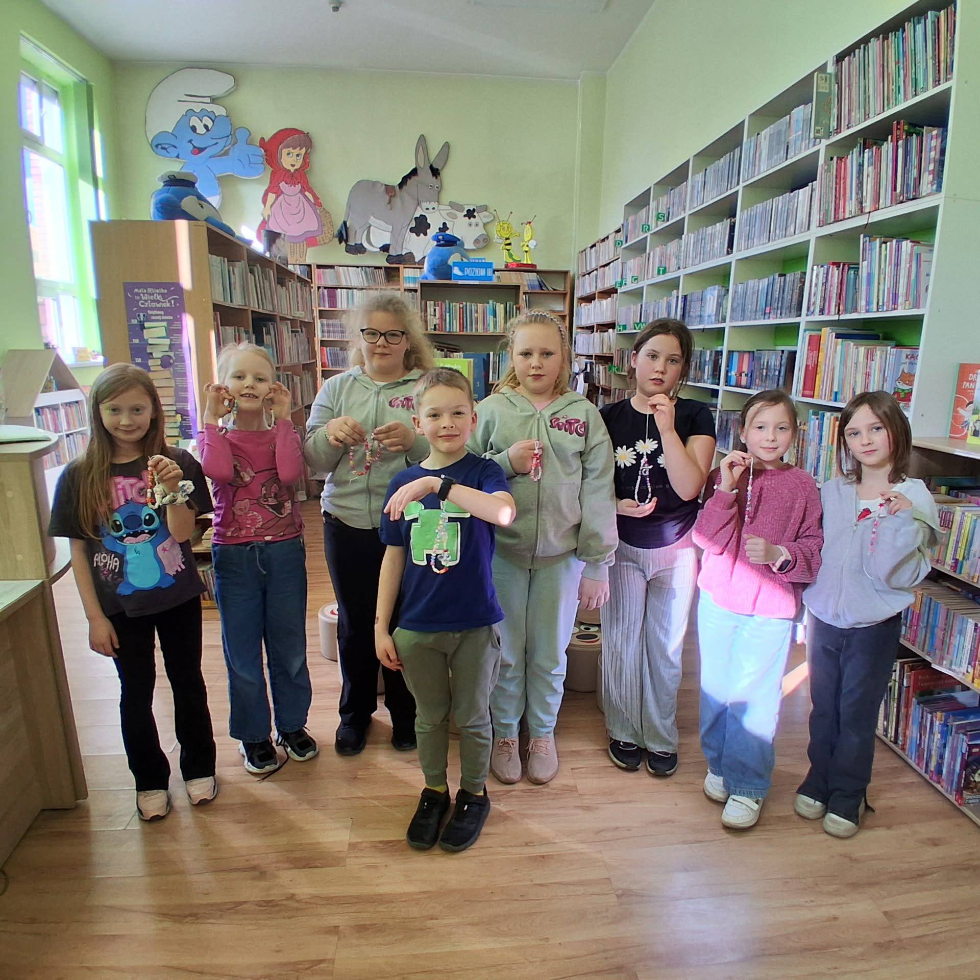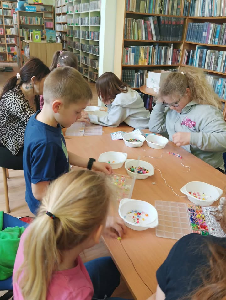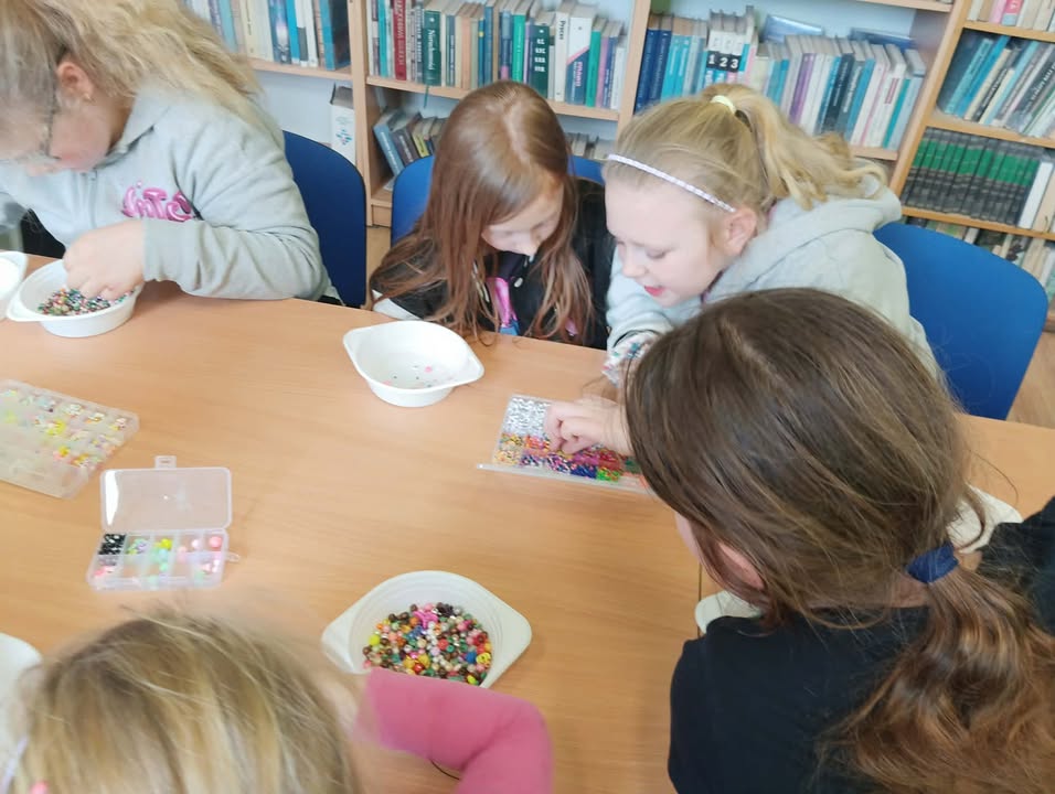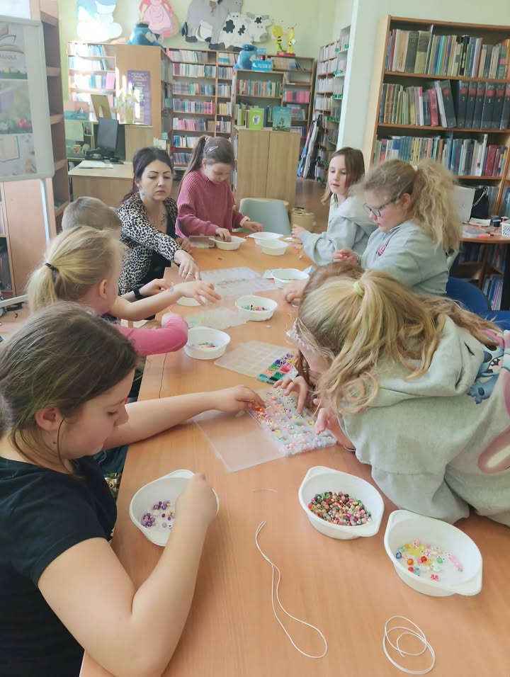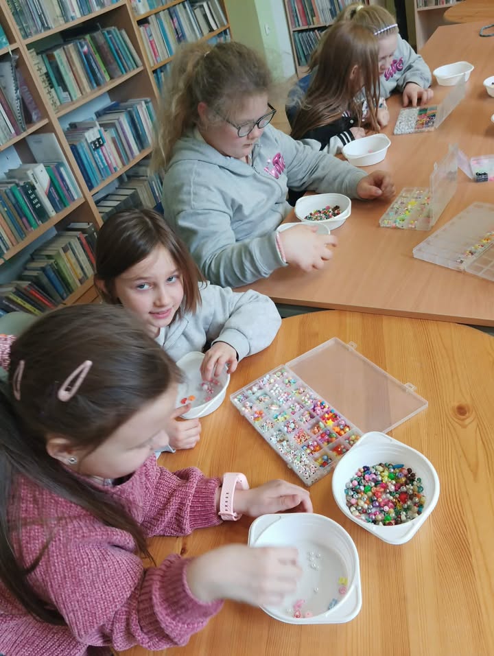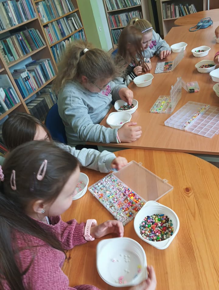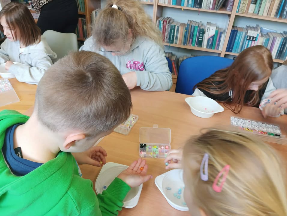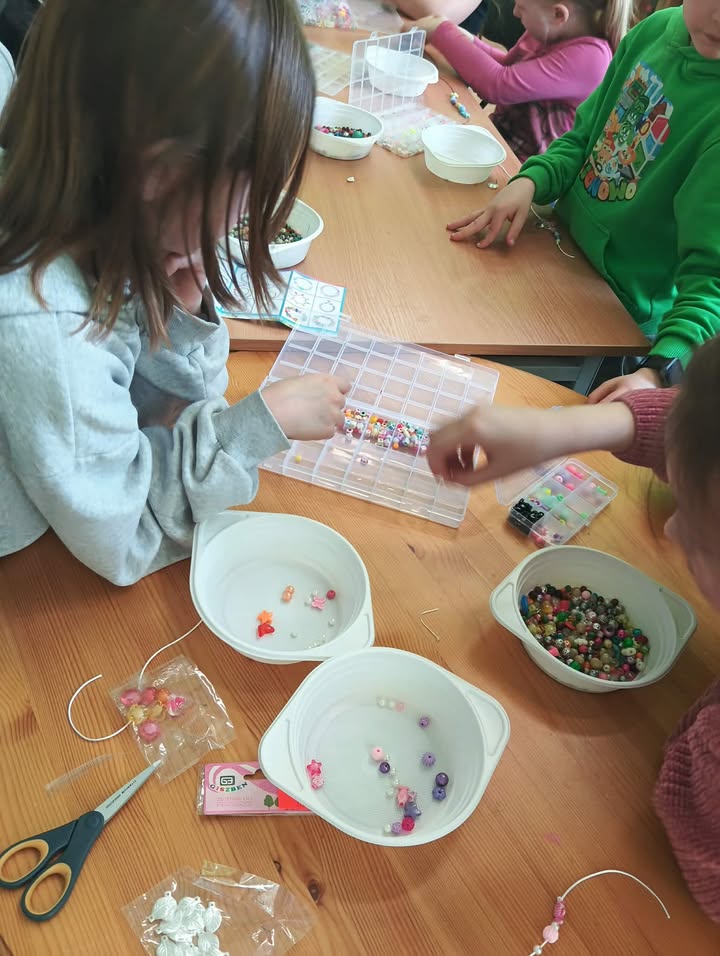Na wczorajszych zajęciach, 9/04/2026 roku uczestnicy wykonywali różnego rodzaju biżuterię. Na początku spotkania uczestnicy zapoznali się z materiałami przeznaczonymi do stworzenia różnorodnych błyskotek. Były to wszelkiego rodzaju koraliki, zawieszki, breloczki, diamenciki, kolczyki oraz kolorowe żyłki. Kreatywność uczestników, jak zawsze, mile nas zaskoczyła. Powstały kolorowe bransoletki z napisami, naszyjniki z pięknymi kamieniami i diamencikami, oraz kolczyki z oryginalnymi zawieszkami.